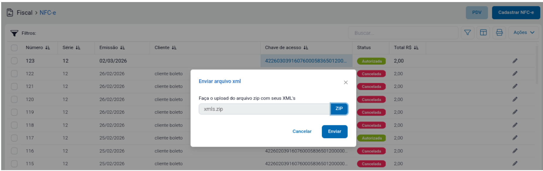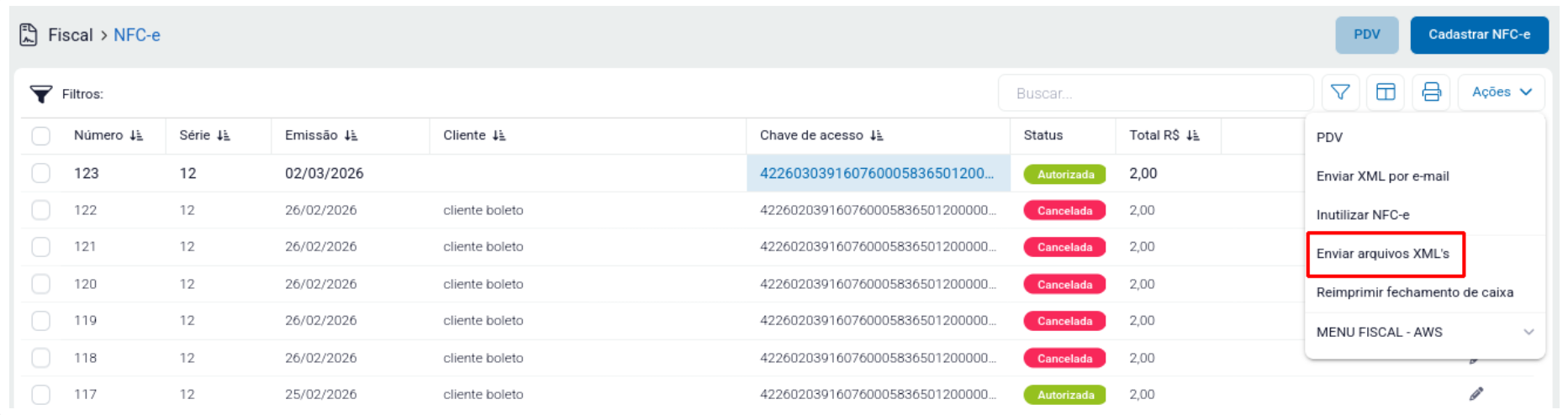Modulo de NFC-e → Ações → Enviar arquivos XML’s