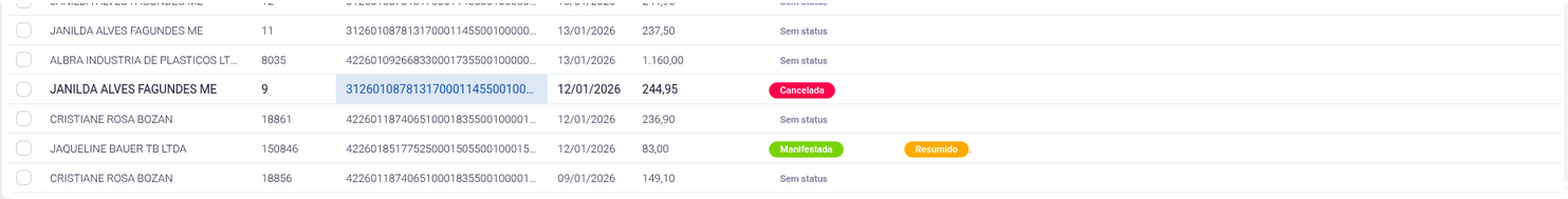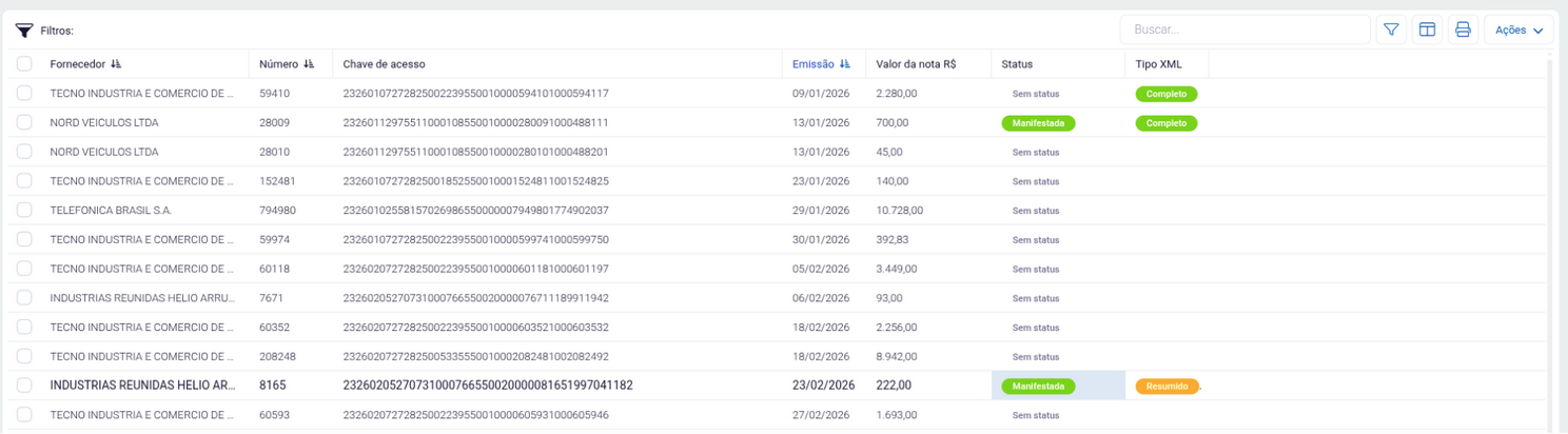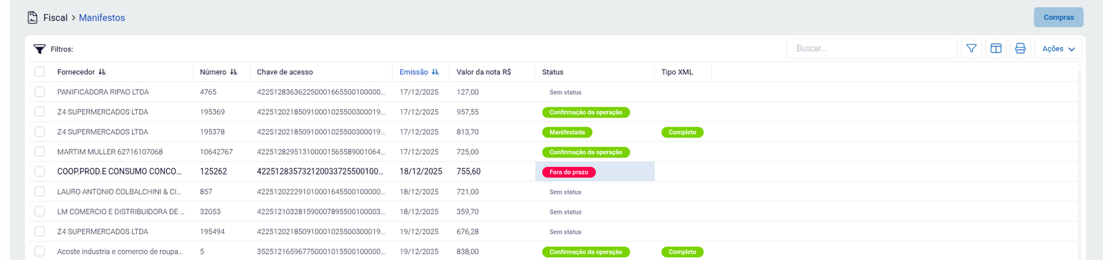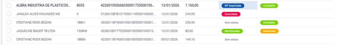 - Ao importar um XML via manifesto para o módulo de Compras, será exibido o status “NF Importada”: