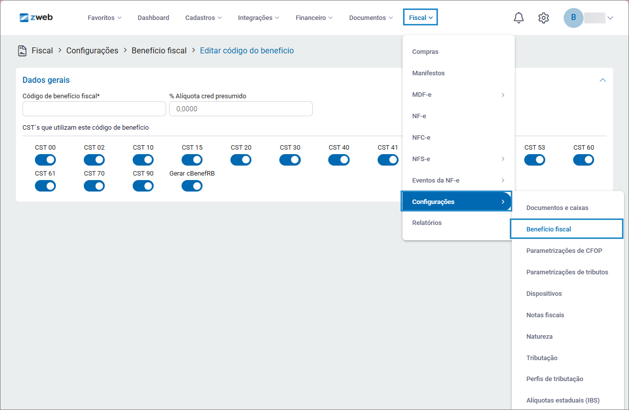 Para cadastrar uma nova tributação, acesse o menu Fiscal > Configurações > Benefício Fiscal.
