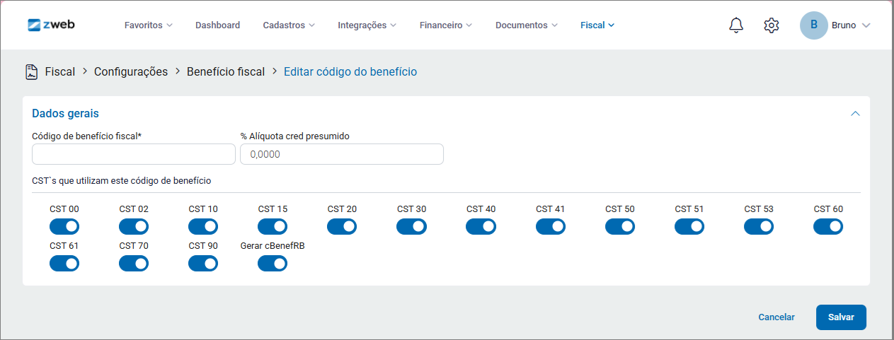 Os campos disponíveis para o cadastro de um novo benefício fiscal são: