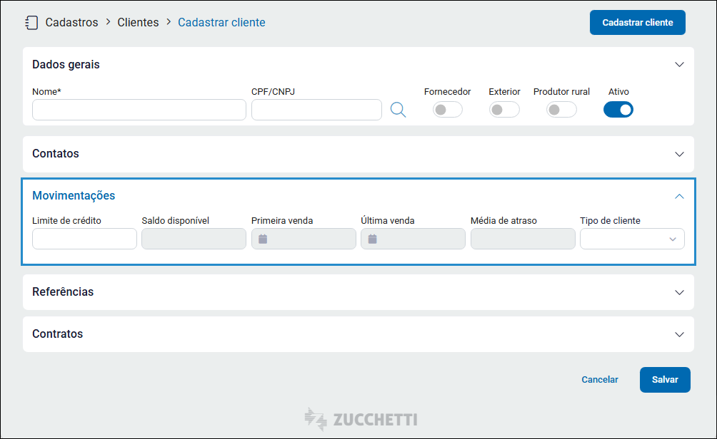 A primeira seção do cadastro é a seção de “Dados gerais”. Nela é possível informar os dados básicos do cliente. Os campos disponíveis na seção de dados gerais são: