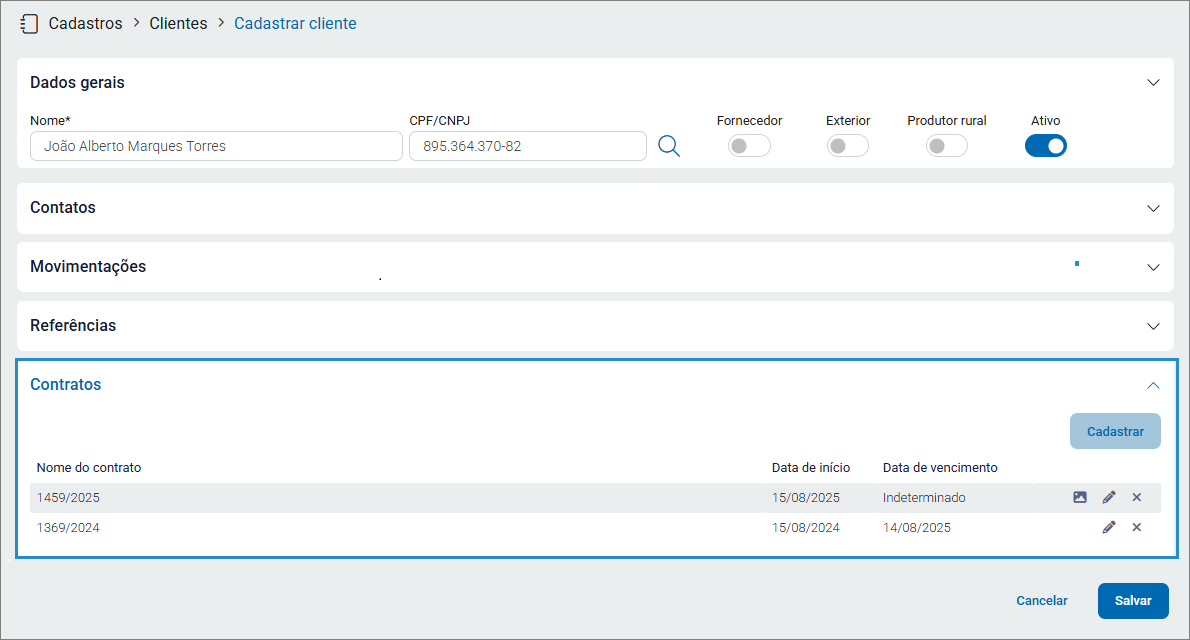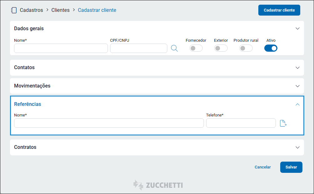 Na seção de referências é possível cadastrar os contatos de referência deste cliente.