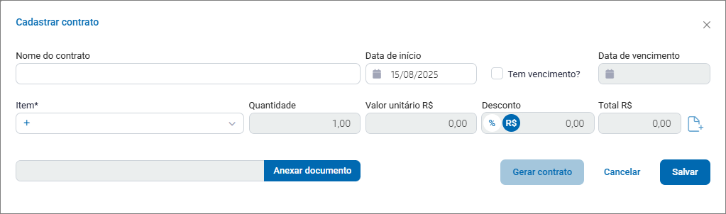 - Gerar contrato: é aberto um formulário para preenchimento do contrato, as opções disponíveis são: