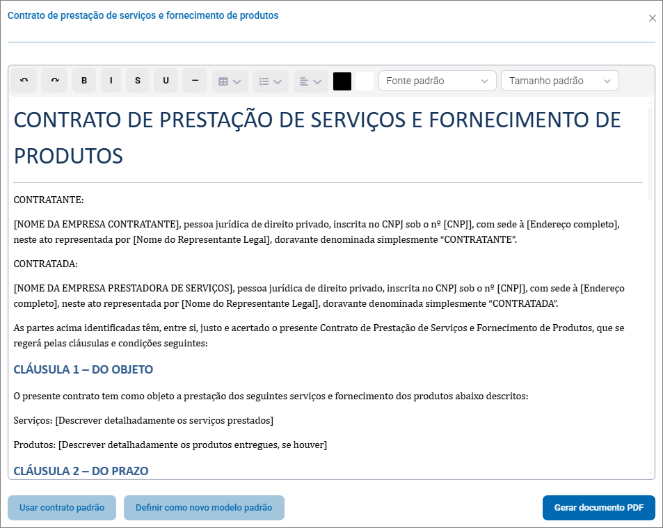 - Usar contrato padrão: o ZWeb disponibiliza um contrato padrão (mostrado acima na imagem), clique para que o modelo seja exibido no espaço para digitação;