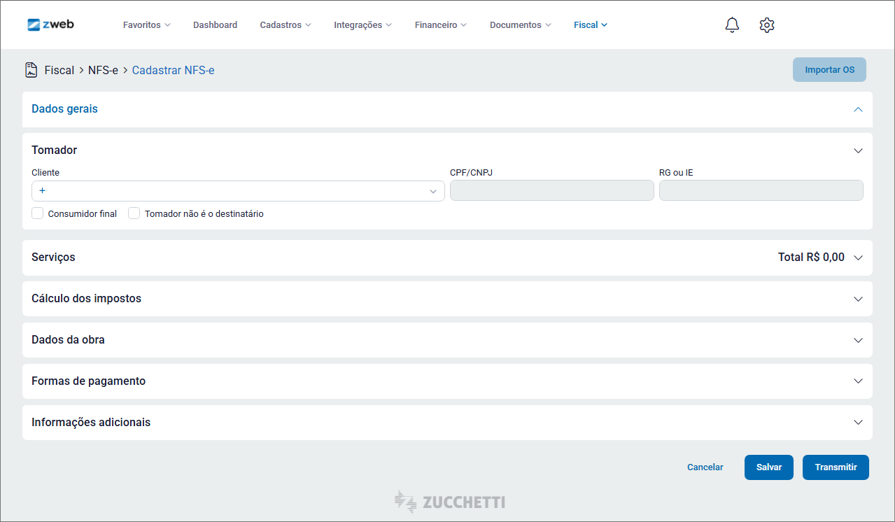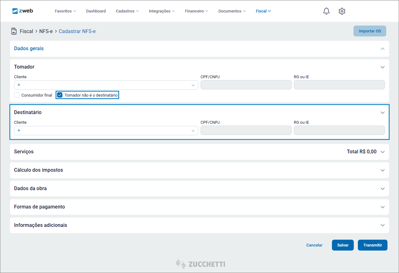 - Tomador não é o destinatário: quando marcado, abre a possibilidade de informar uma segunda pessoa ou empresa que receberá o serviço.