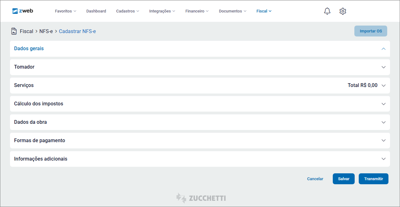 Ao finalizar o cadastro da NFS-e, clique em “Salvar” para gravar ou em “Transmitir” para enviá-la ao município.