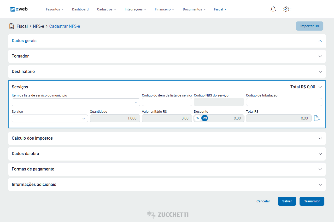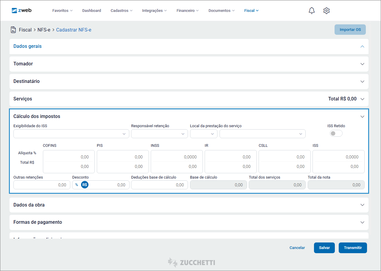 Os campos disponíveis nas abas de serviços e cálculo dos impostos para a emissão de uma nova NFS-e são: