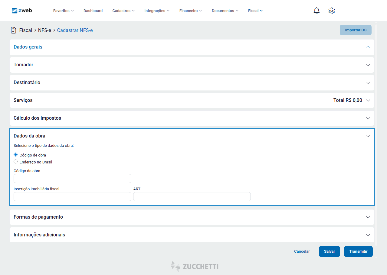 Utilizado quando a nota está vinculada a uma obra, comum em serviços de construção civil. Neste grupo, são disponibilizadas as seguintes opções: