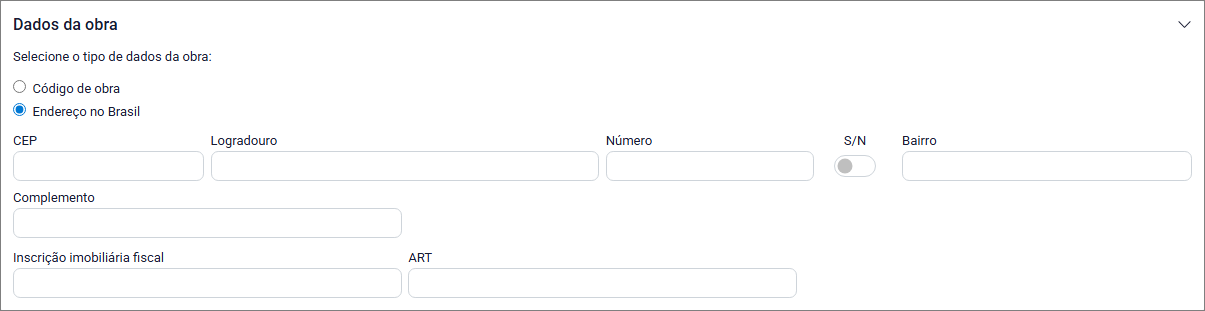 - Endereço no Brasil: alternativa ao código de obra, permitindo informar os dados completos do local. Ao selecionar essa opção, são exibidos: