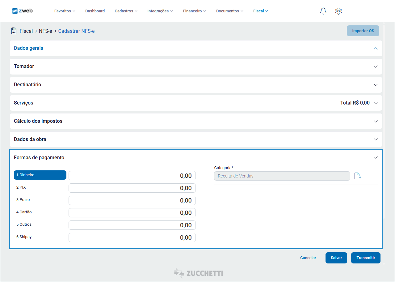 Informe o valor na forma de pagamento para adicioná-la à NFS-e.