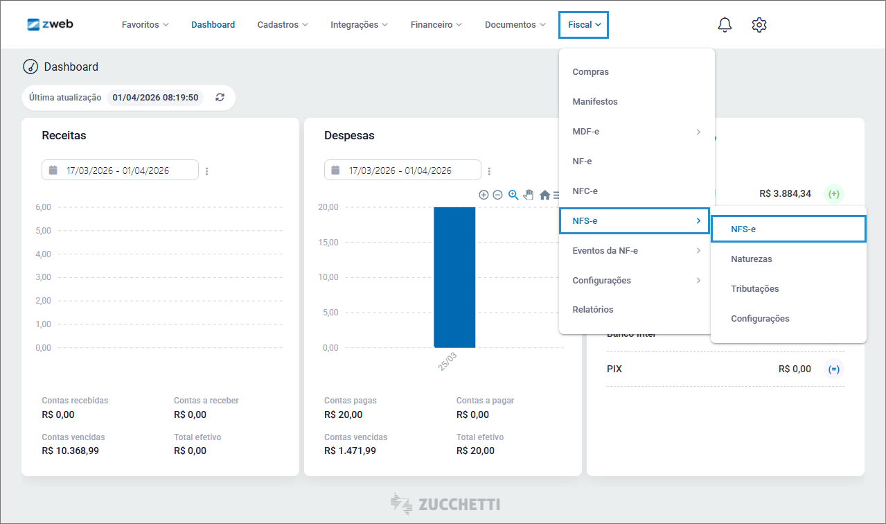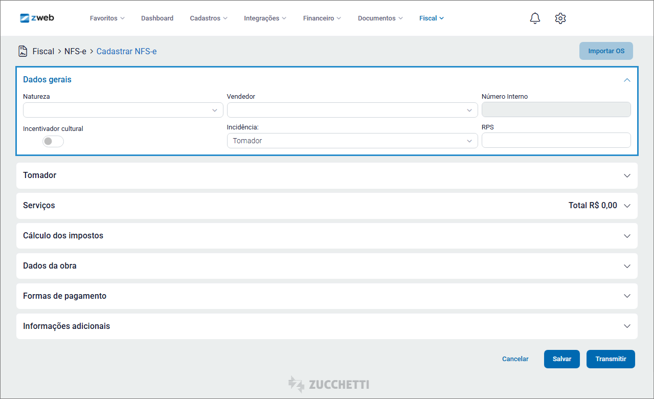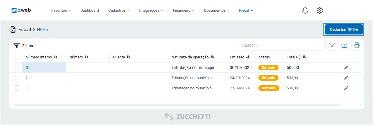Para lançar a NFS-e, acesse o menu Fiscal > NFS-e > NFS-e.