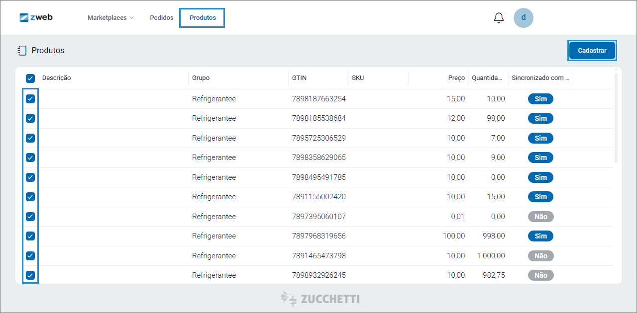 No menu “Produtos”, marque os produtos que serão enviados ao marketplace e clique em “Cadastrar”.