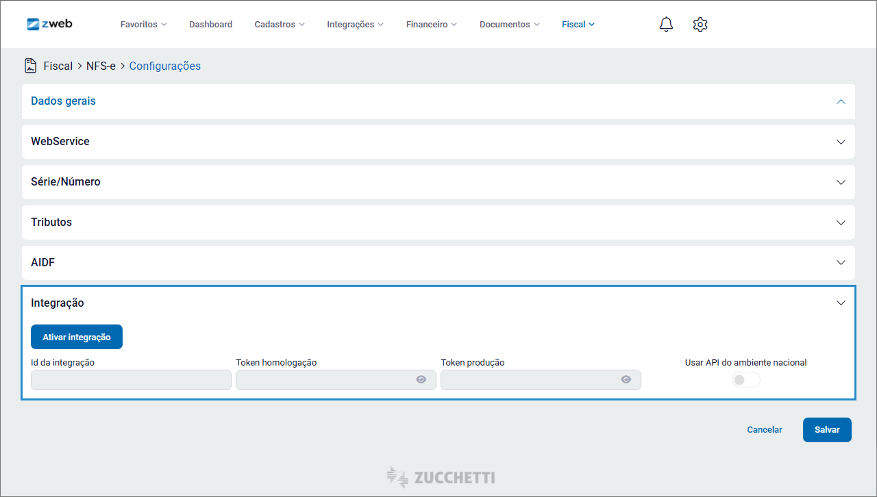 Para habilitar a integração, acesse o menu Fiscal > NFS-e > Configurações > Integração.