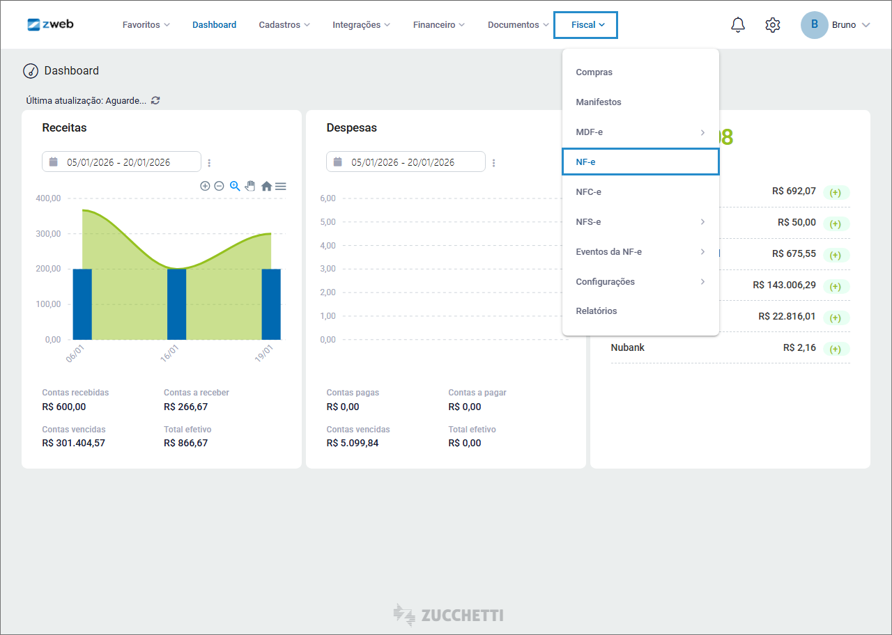 - Cadastrar NF-e: cadastro e emissão da Nota Fiscal Eletrônica.
