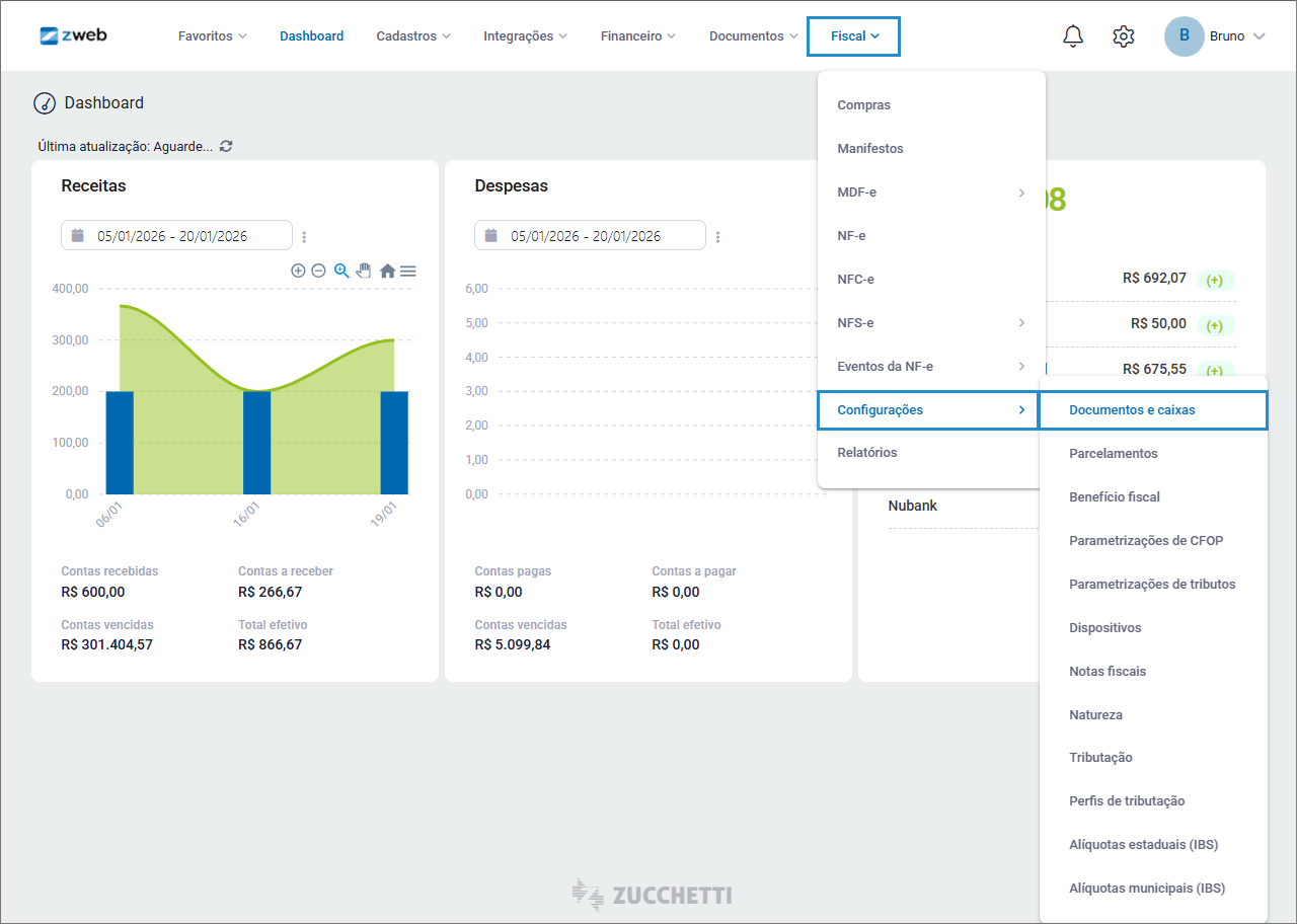Acesse o menu Fiscal > Configurações > Documentos e caixas.