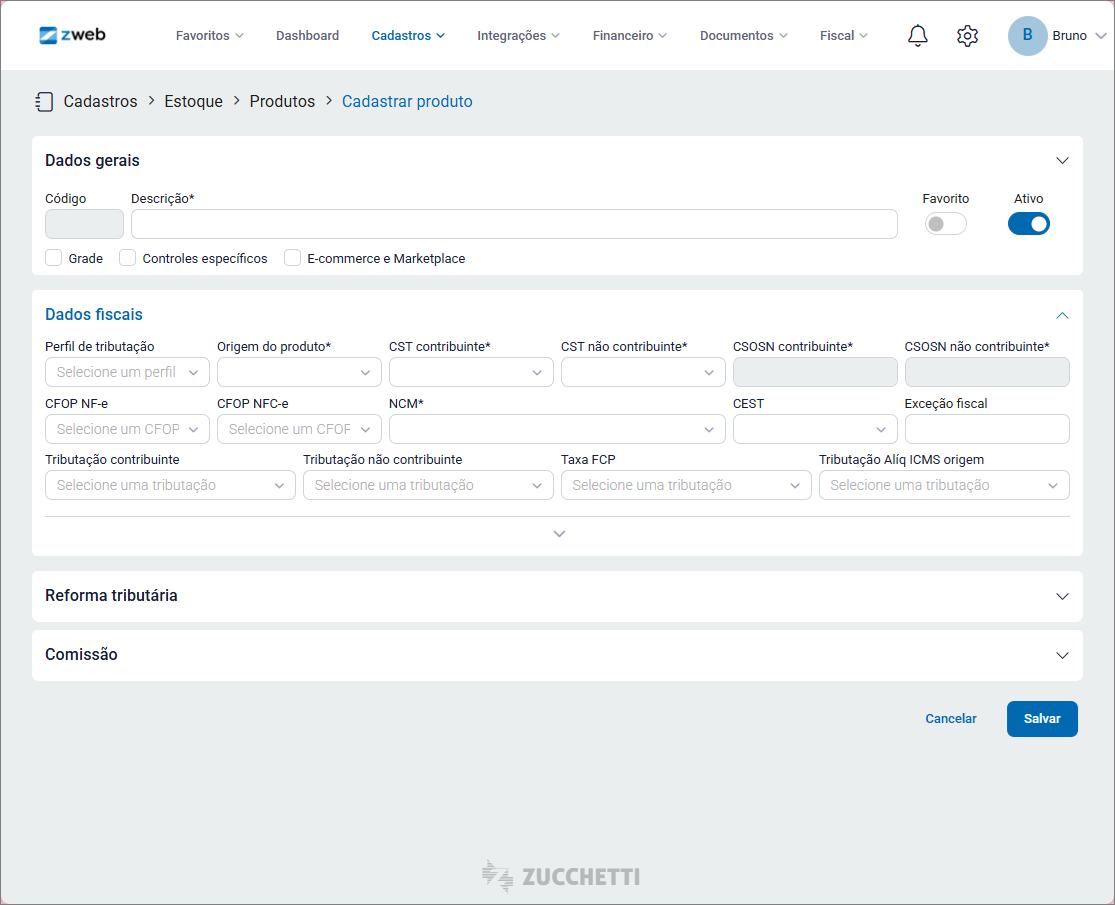 Os campos da “Origem do produto”, “CST” ou “CSOSN” (de acordo com o CRT da empresa) e o “NCM”, são obrigatórios na seção de “Dados fiscais”.